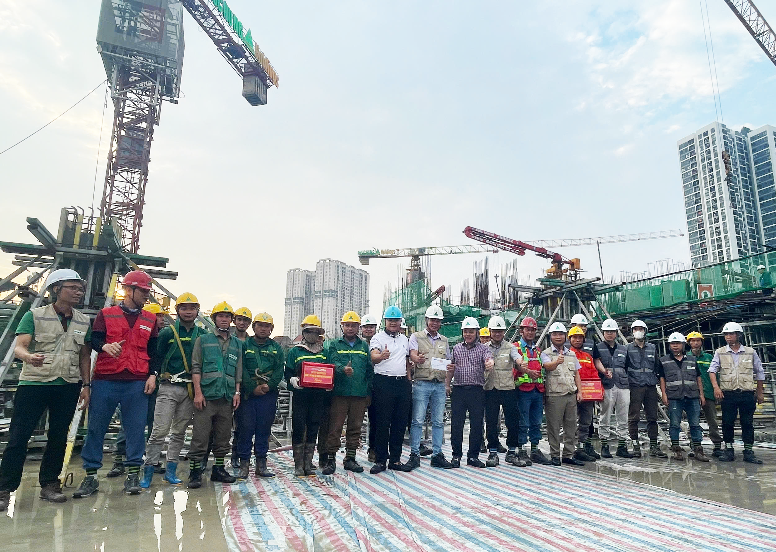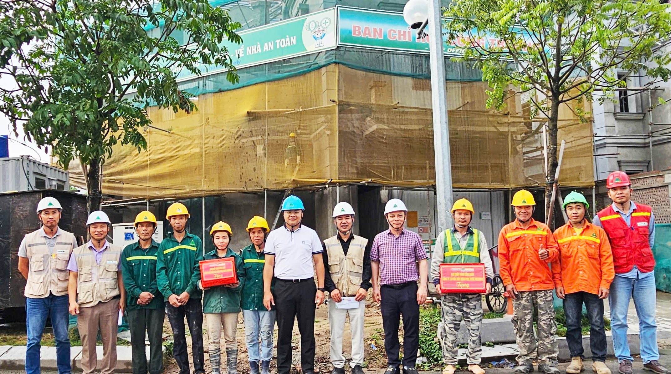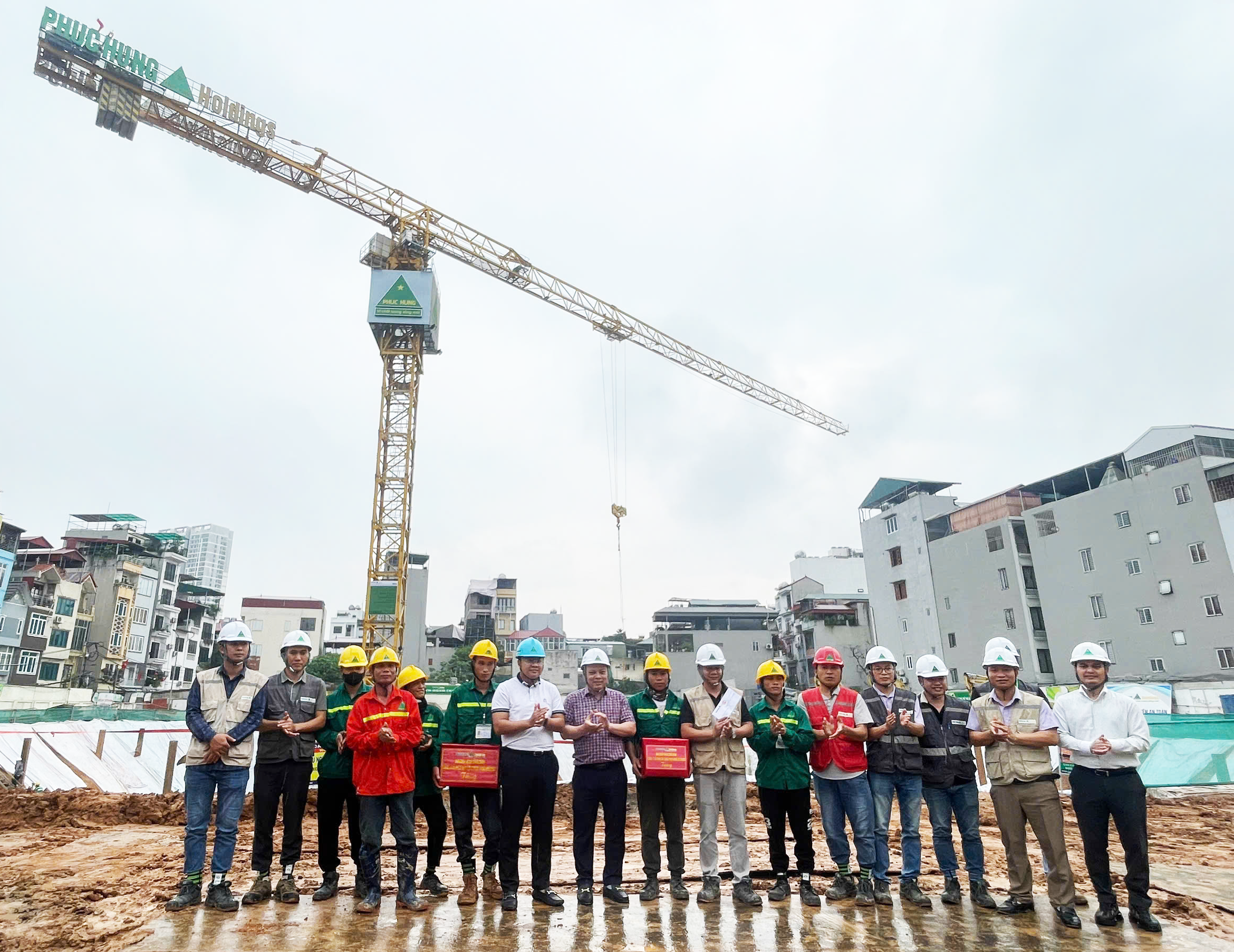 Đại diện Ban Lãnh đạo Phục Hưng Holdings trao quà động viên Tổ/Đội đang làm việc tại Công trường Bệnh viện Tim Cơ sở 2