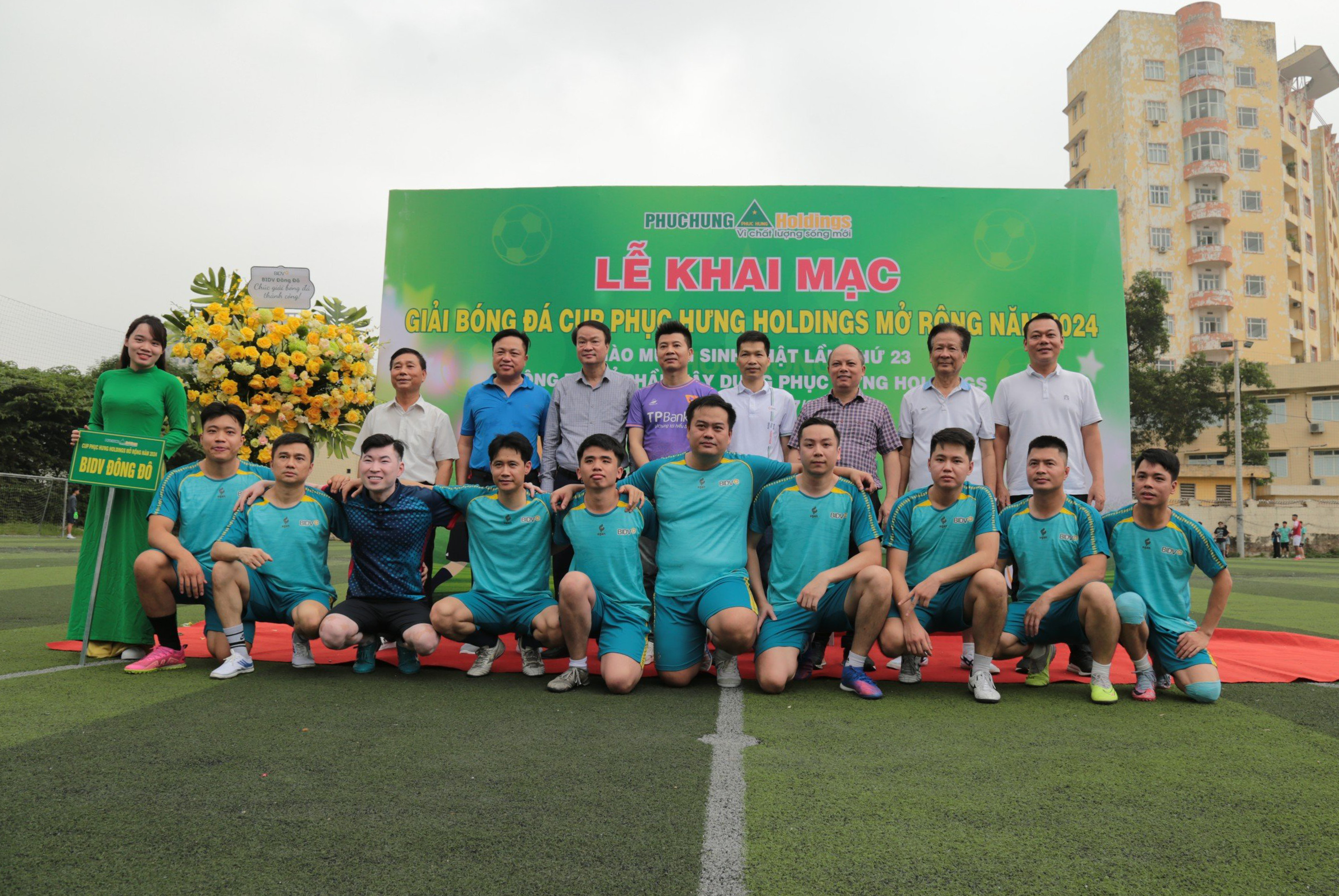Ông Lê Viết Dung Giám đốc chi nhánh BIDV Đông Đô và Lãnh đạo PHC Chụp ảnh lưu niệm cùng đội bóng BIDV Đông Đô tại Lễ khai mạc “Giải bóng đá CUP Phục Hưng Holdings mở rộng năm 2024”