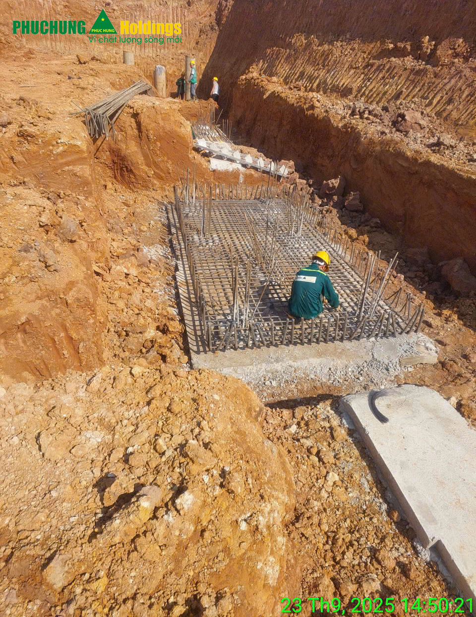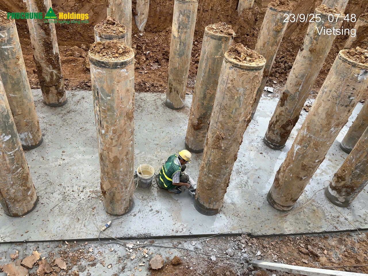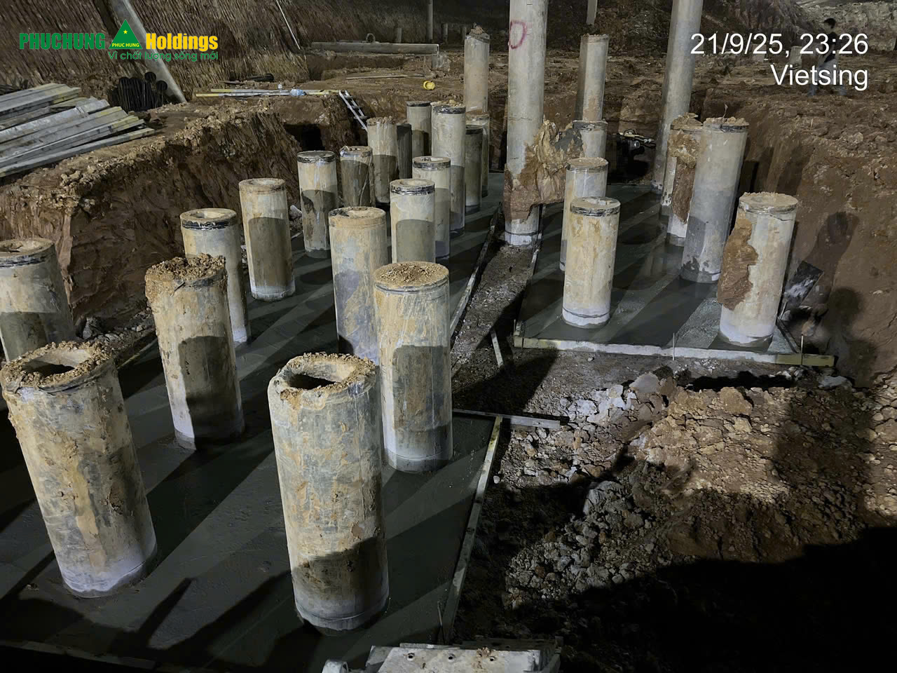Hiện nay, các hạng mục nền móng đang được triển khai đồng bộ, bao gồm: đào đất, thi công cọc móng, lắp đặt cốt thép cọc, thi công dải giằng móng... Theo kế hoạch, phần móng công trình sẽ cơ bản hoàn thành vào tháng 11/2025 và nền sẽ đủ điều kiện hoàn trả trong tháng 12/2025.