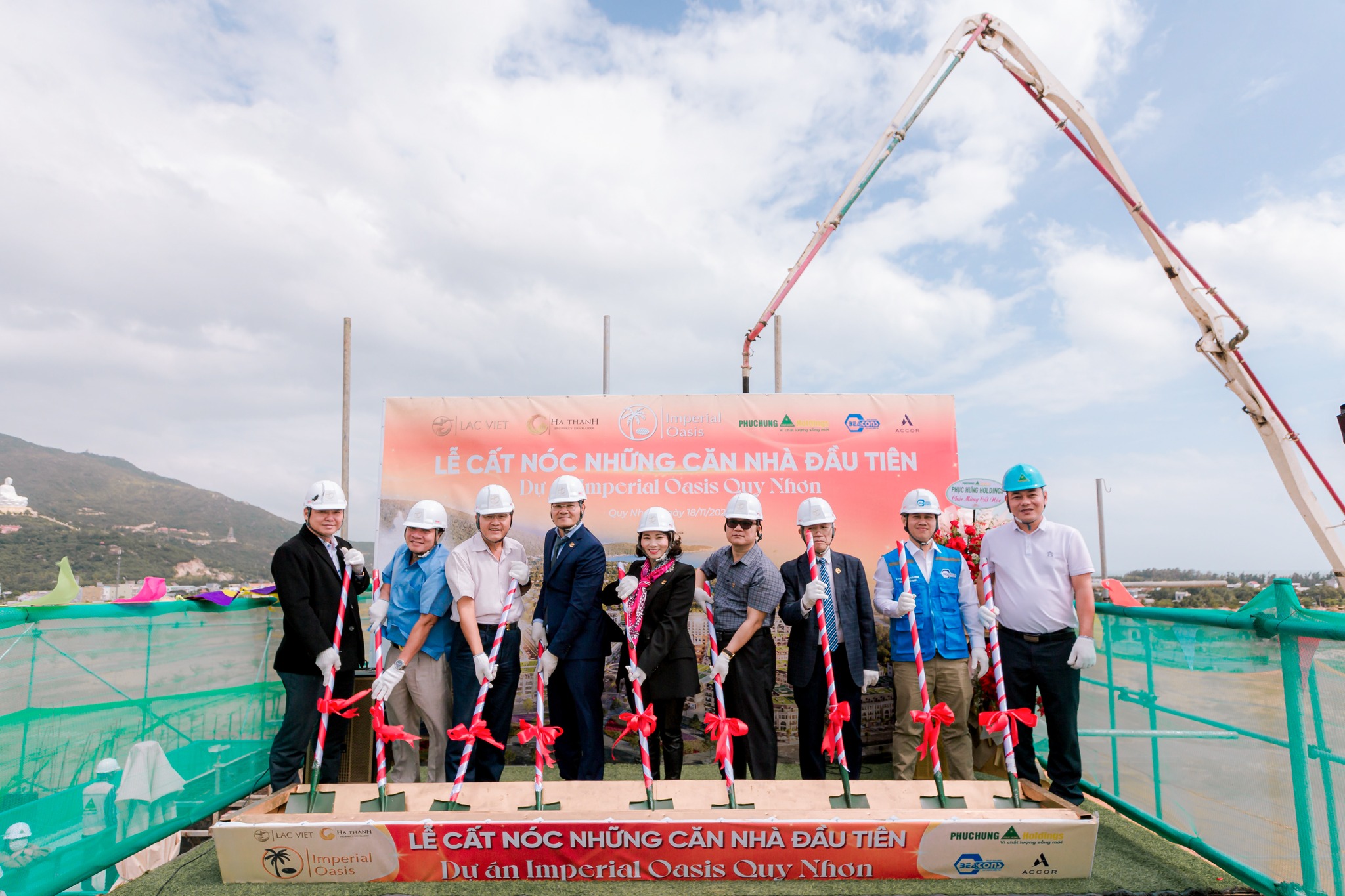 Đại diện Lãnh đạo địa phương, Ban quản lý khu kinh tế tỉnh Bình Định, Chủ đầu tư Tập đoàn Lạc Việt, Tư vấn xây dựng Beacons Việt Nam, R&D Consultant và Tổng thầu Phục Hưng Holdings thực hiện nghi thức đổ bê tông cất nóc những căn nhà đầu tiên tại dự án Imperial Oasis Quy Nhơn