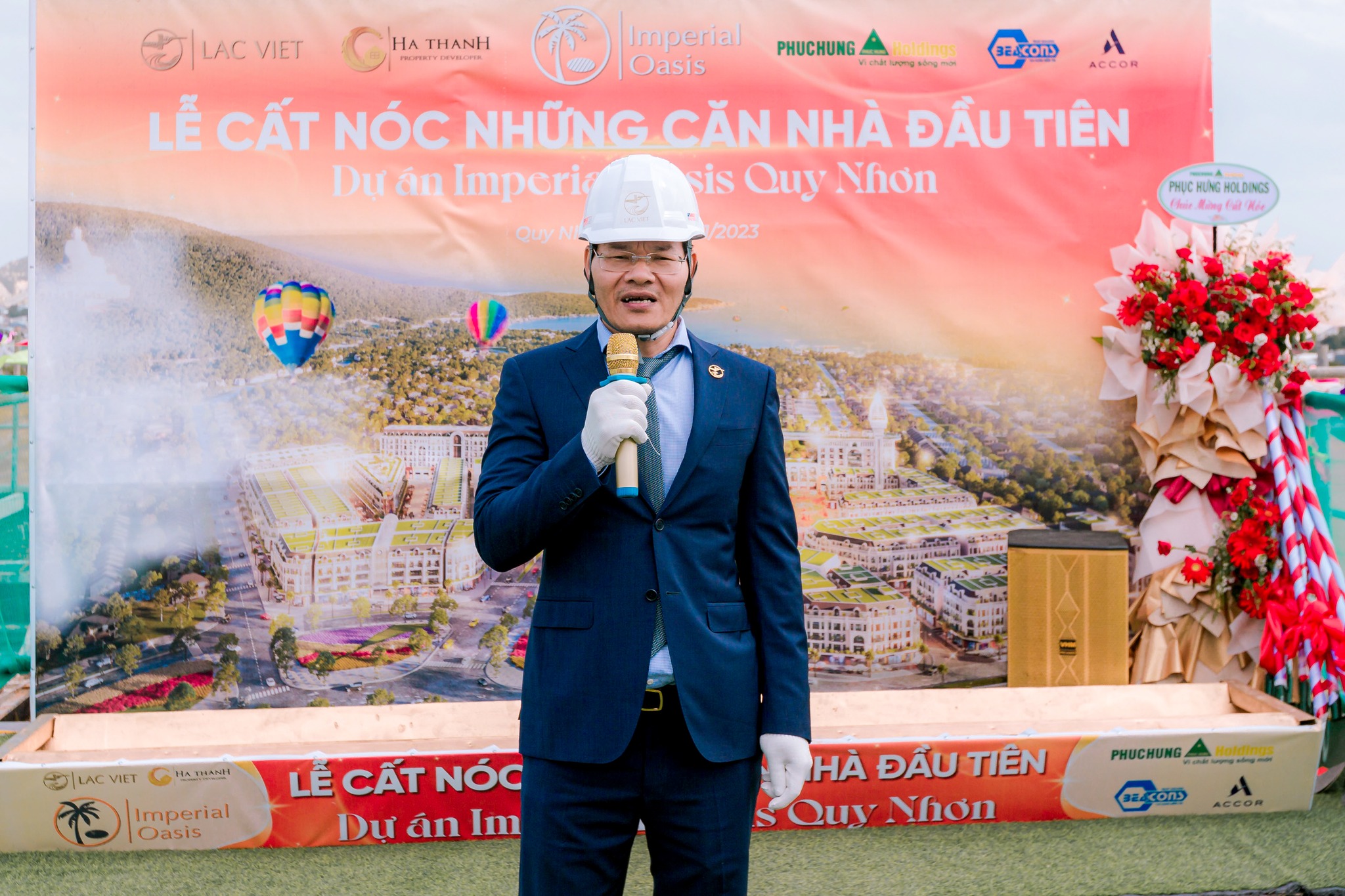 Ông Lê Quốc Tuấn – Phó Tổng giám đốc Tổng thầu Phục Hưng Holdings phát biểu tại Lễ cất nóc