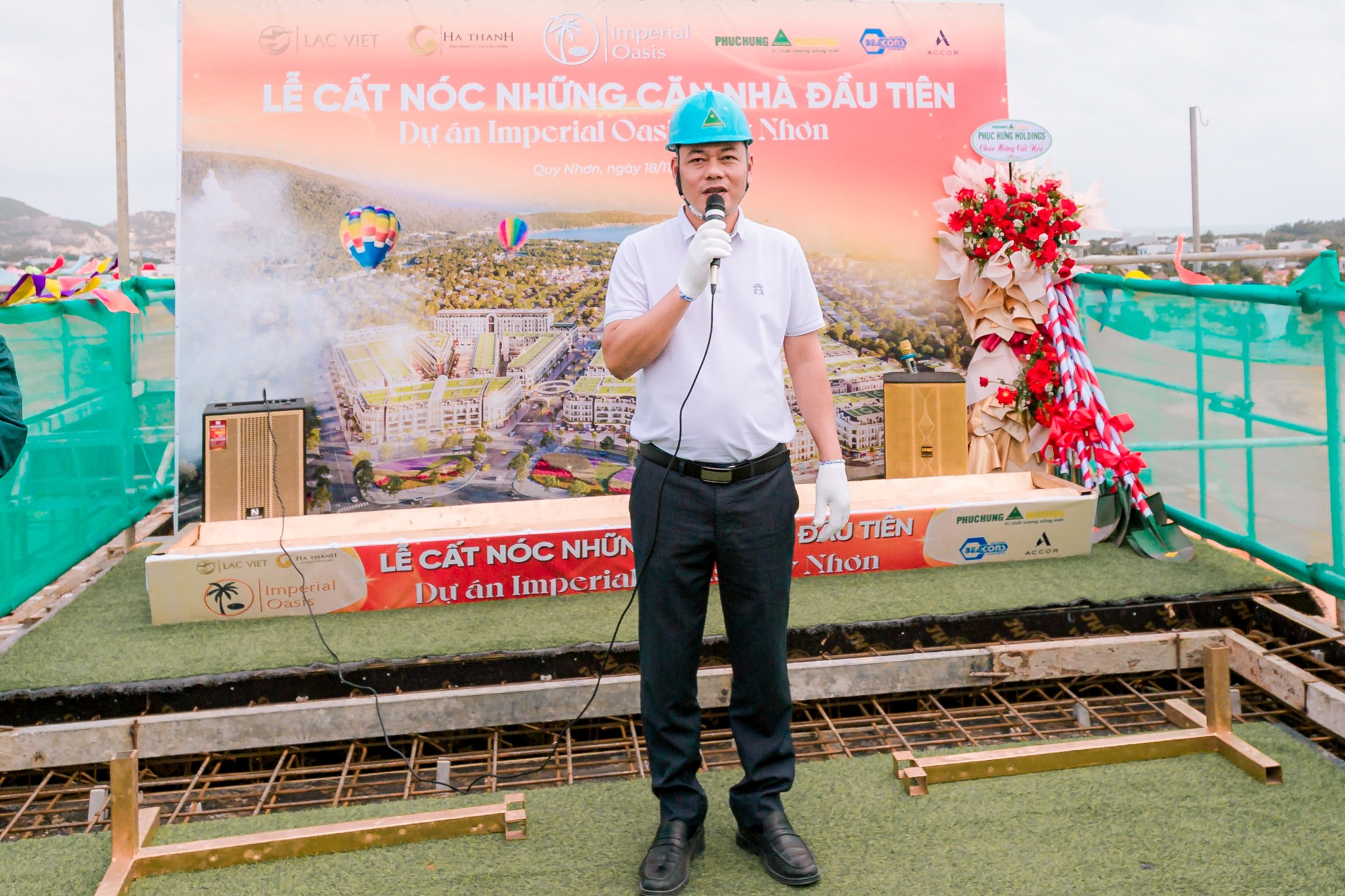Dự án Imperial Oasis Quy Nhơn được khởi công ngày 02/8/2023 trên tổng diện tích 8,9 ha với 337 sản phẩm shophouse, hotel. Ban chỉ huy công trình cùng đội ngũ kỹ sư, công nhân của Phục Hưng Holdings đã luôn nỗ lực làm việc, tập trung nguồn lực, trang thiết bị, đảm bảo triển khai thi công Dự án an toàn, chất lượng và đúng tiến độ cam kết với Chủ đầu tư. Sự kiện cất nóc những căn nhà đầu tiên tại Dự án là cột mốc quan trọng khẳng định uy tín và năng lực của Tổng thầu Phục Hưng Holdings.