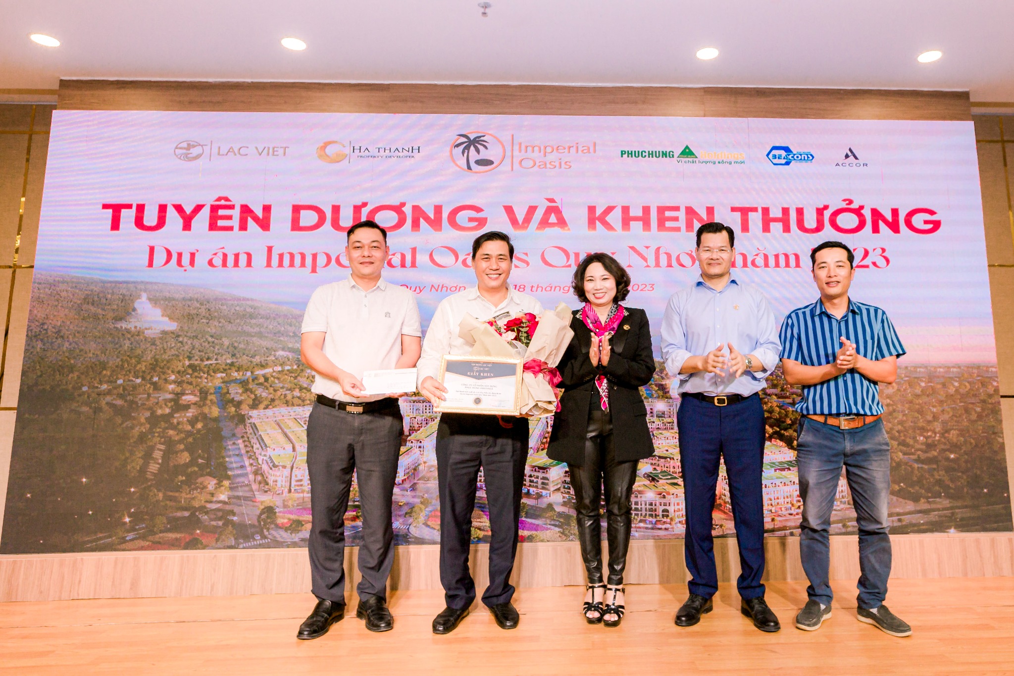 Tại buổi tiệc chúc mừng sự kiện này, Chủ đầu tư Tập đoàn Lạc Việt đã tuyên dương và khen thưởng cho Tổng thầu Phục Hưng Holdings “Đạt thành tích xuất sắc Gói tổng thầu xây dựng dự án Imperial Oasis Quy Nhơn năm 2023”.