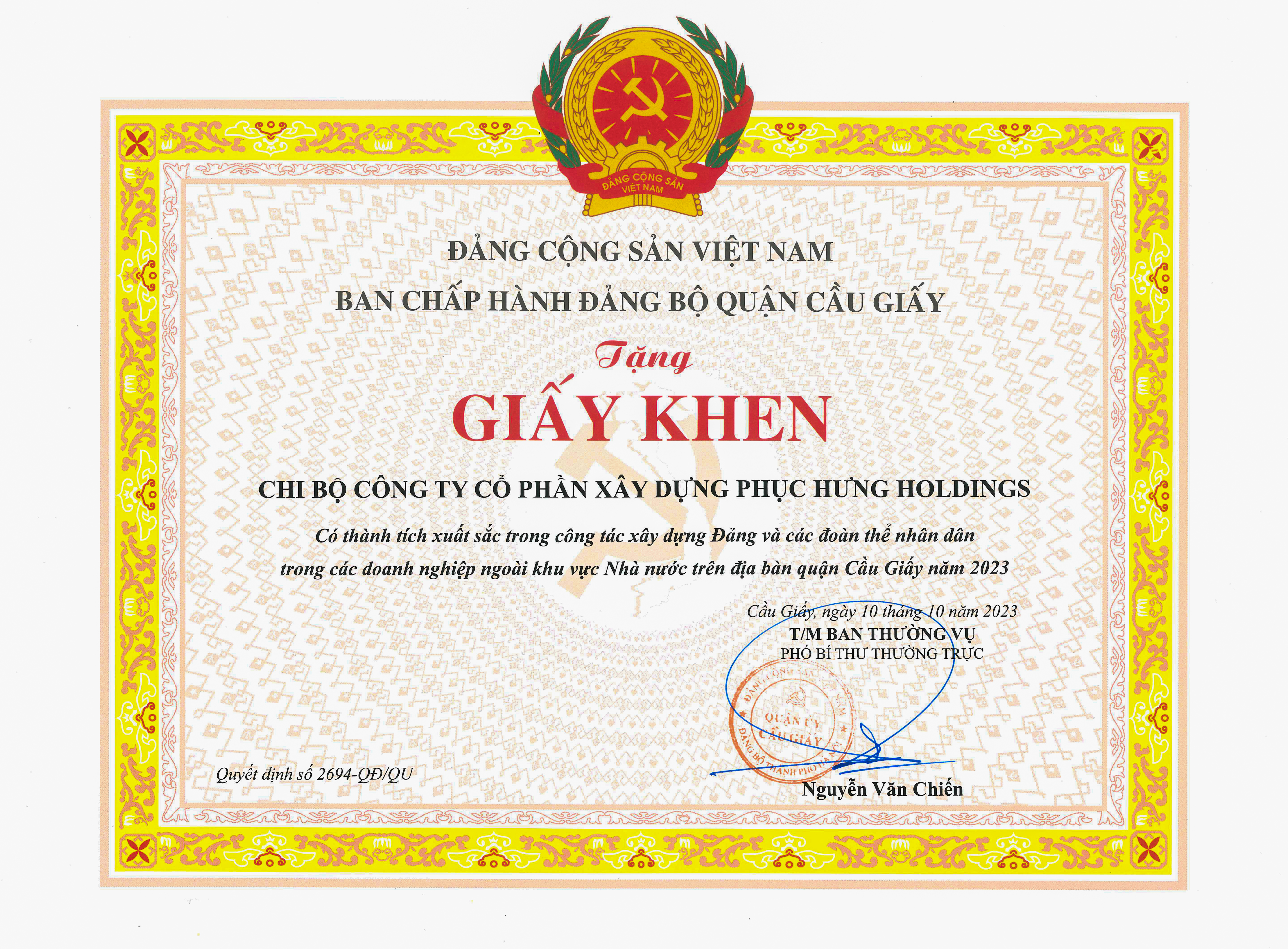 Chi bộ đảng Phục Hưng Holdings vinh dự được Đảng bộ Khối Doanh nghiệp quận Cầu Giấy biểu dương, khen thưởng là một trong 10 tập thể có thành tích xuất sắc trong công tác xây dựng Đảng và các đoàn thể nhân dân trong các doanh nghiệp ngoài khu vực Nhà nước trên địa bàn quận Cầu Giấy năm 2023.