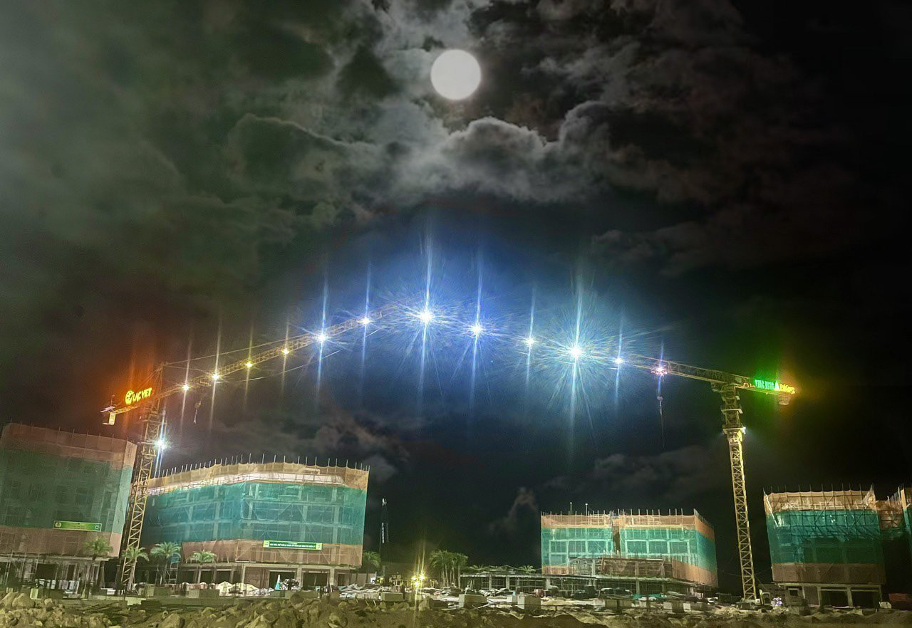Hình ảnh được ghi lại từ trên cao, mặc dù thời tiết khắc nghiệt, nắng nóng về đêm nhưng công nhân vẫn rộn ràng tăng ca đổ bê tông móng LK01.