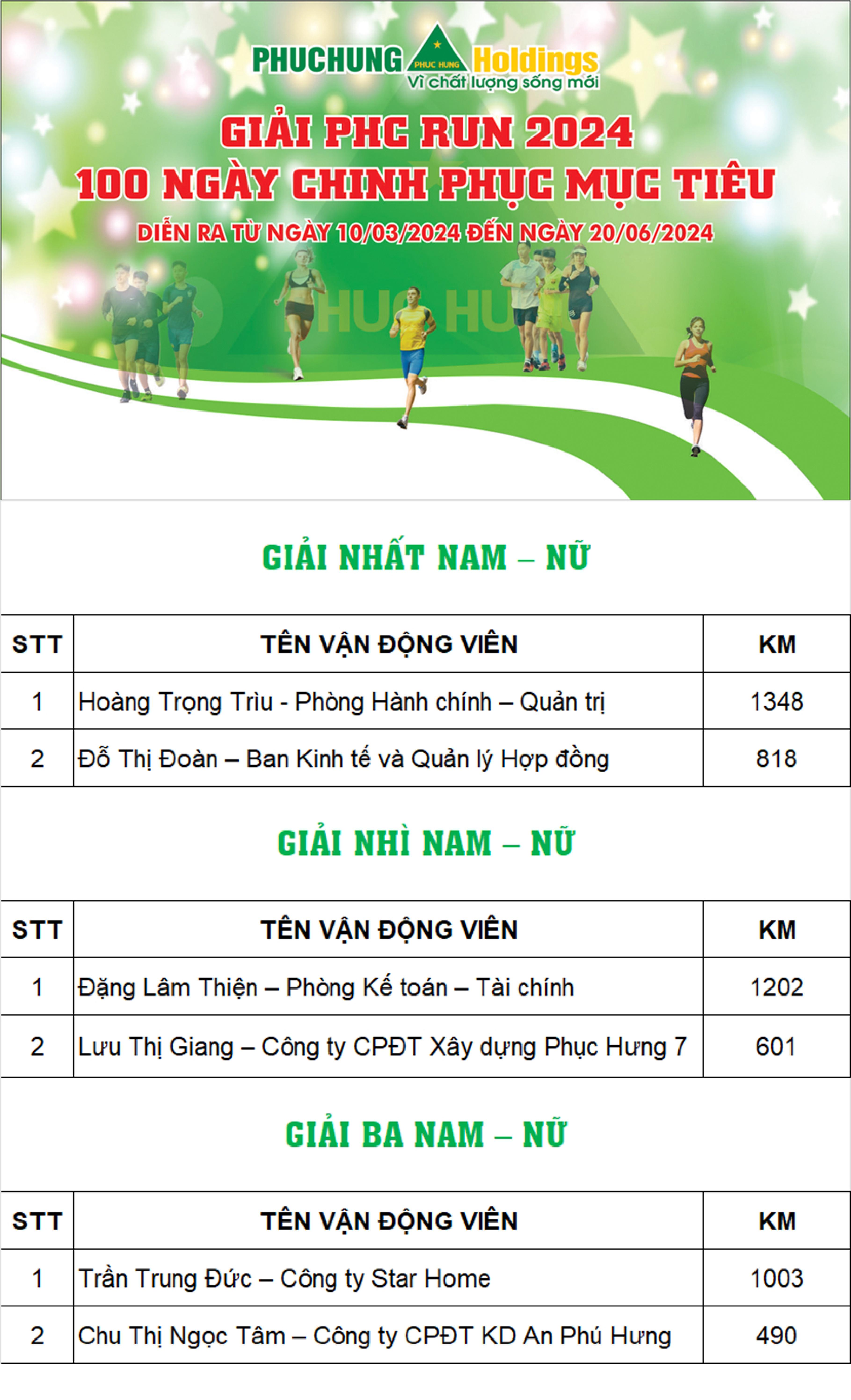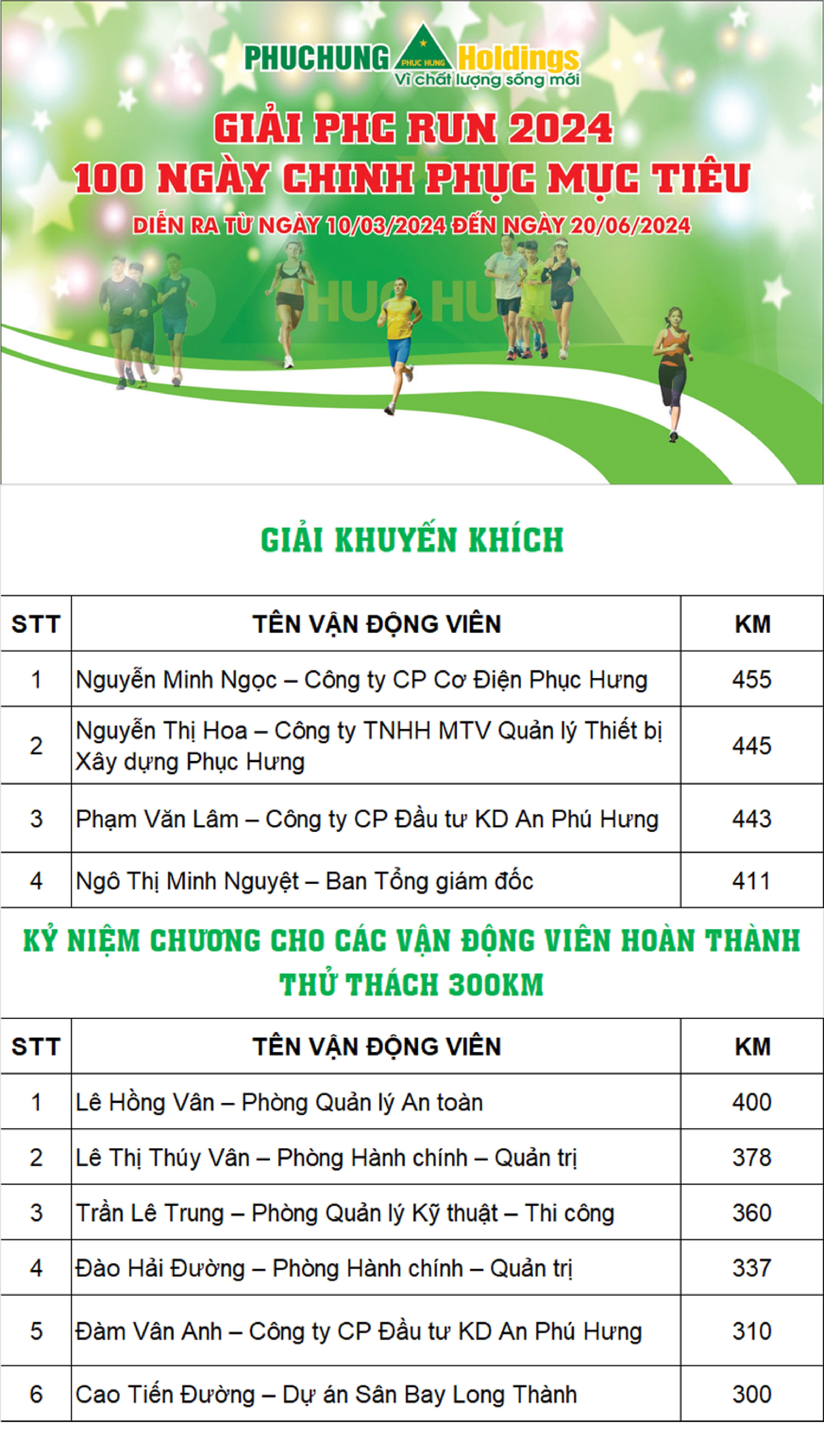 Giải "PHC RUN 2024" diễn ra từ 10/03 đến ngày 20/06, sử dụng phần mềm UPRACE để đo quãng đường, tốc độ & xếp hạng. Với thử thách quãng đường chạy tối thiểu 300 km, "PHC RUN 2024" đã thể hiện được sức hút & lan tỏa mạnh mẽ hình thức thể dục thể thao trực tuyến. PHC RUN 2024 đã chính thức khép lại đường đua với nhiều thành tích mới được xác lập.