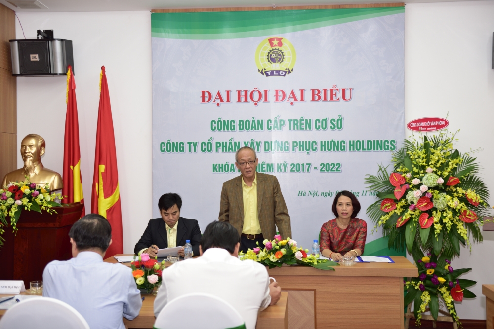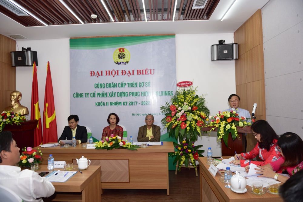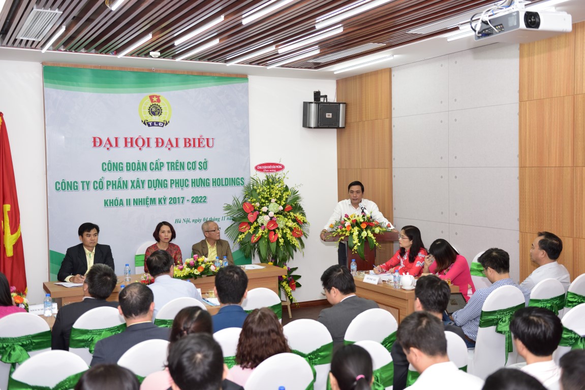 Đại hội vinh dự được đón đồng chí Vũ Ngọc Chính, Phó Chủ tịch Công đoàn Xây dựng Việt Nam; đồng chí Nguyễn Thị Thanh Hương, Ủy viên Ban Thường vụ, Trưởng ban Tài chính Công đoàn Xây dựng Việt Nam; đồng chí Cao Tùng Lâm, Bí thư Đảng ủy, Chủ tịch hội đồng quản trị Công ty; đồng chí Trần Huy Tưởng, Tổng Giám đốc Công ty cùng 52 đại biểu đại diện cho 497 đoàn viên công đoàn Công ty. Đại hội đã được nghe dự thảo báo cáo tổng kết hoạt động công đoàn nhiệm kỳ 2012-2017 và phương hướng hoạt động công đoàn trong nhiệm kỳ 2017-2022 và nghiêm túc đánh giá việc thực hiện 04 chương trình hành động và 11 chỉ tiêu của Công đoàn Xây dựng Việt Nam. Đại hội đã tổng hợp ý kiến đóng góp với dự thảo Báo cáo tổng kết hoạt động công đoàn, phong trào CNVC lao động nhiệm kỳ 2013-2018 và phương hướng hoạt động nhiệm kỳ 2018-2023 của Công đoàn Xây dựng Việt Nam; Tổng hợp ý kiến tham gia sửa đổi Điều lệ Công đoàn Việt Nam. Đại hội đã được nghe 03 tham luận của Công đoàn cơ sở đóng góp bổ sung cho báo cáo của BCH Công đoàn Công ty, cũng như nêu các giải pháp để hoạt động công đoàn và phong trào CBCNV ngày càng thiết thực, hiệu quả. Với khẩu hiệu: “Ở đâu có lao động, ở đó có công đoàn”; “Công đoàn Phục Hưng kết nối mọi người cùng phát triển”. Phát biểu tại Đại hội, đồng chí Cao Tùng Lâm, Bí thư Đảng ủy, Chủ tịch HĐQT Công ty đánh giá cao những đóng góp và thành tích của Công đoàn, đoàn viên công đoàn và người lao động vào sự phát triển chung của Công ty cổ phần Xây dựng Phục Hưng Holdings. Tại Đại hội, đồng chí đề nghị BCH đẩy mạnh các hoạt động xã hội và chăm lo đời sống đoàn viên, người lao động; phát huy vai trò trách nhiệm của đoàn viên và người lao động trong việc kết nối mọi người cùng phát triển. Thực hiện tốt công tác vệ sinh, chăm lo điều kiện ăn, ở cho người lao động tại các công trường, tuyên truyền và hướng dẫn người lao động kiến thức bảo vệ sức khỏe, phòng chống dịch bệnh, vệ sinh môi trường; tổ chức các phong trào rèn luyện sức khỏe…