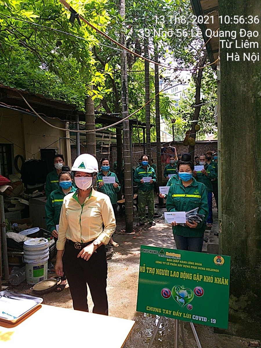 Ngày 13/8/2021 vừa qua, đại diện Công đoàn ông Trần Thắng Lợi-Phó Tổng giám đốc kiêm Chủ tịch Công đoàn cấp trên Phục Hưng Holdings và bà Tô Thị Hồng Điệp-Chủ tịch Công đoàn khối Văn phòng đã đi kiểm tra công tác phòng/chống dịch tại các khu lán trại của công nhân thuộc dự án Mỹ Đình Pearl. Thay mặt Ban chấp hành Công đoàn, ông Trần Thắng Lợi động viên và chia sẻ khó khăn với anh em công nhân trong giai đoạn này. Bên cạnh sự sẻ chia về tinh thần, Công đoàn Phục Hưng Holdings đã trao tặng hơn 1000 khẩu trang y tế và 142 suất quà trị giá hơn 150 triệu đồng, hỗ trợ tiền ăn cho các công nhân không về quê được phải ở lại các khu lán trại.