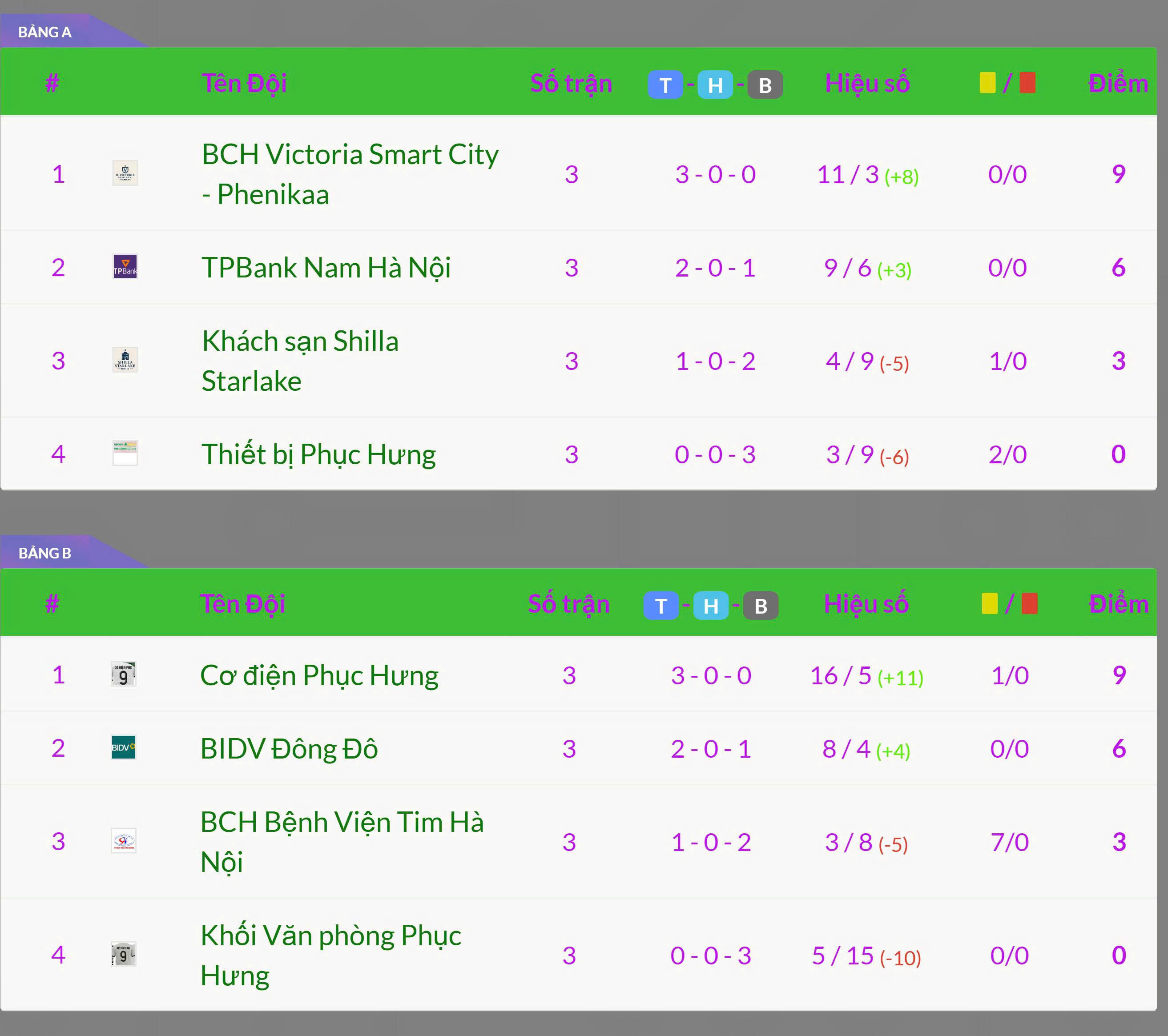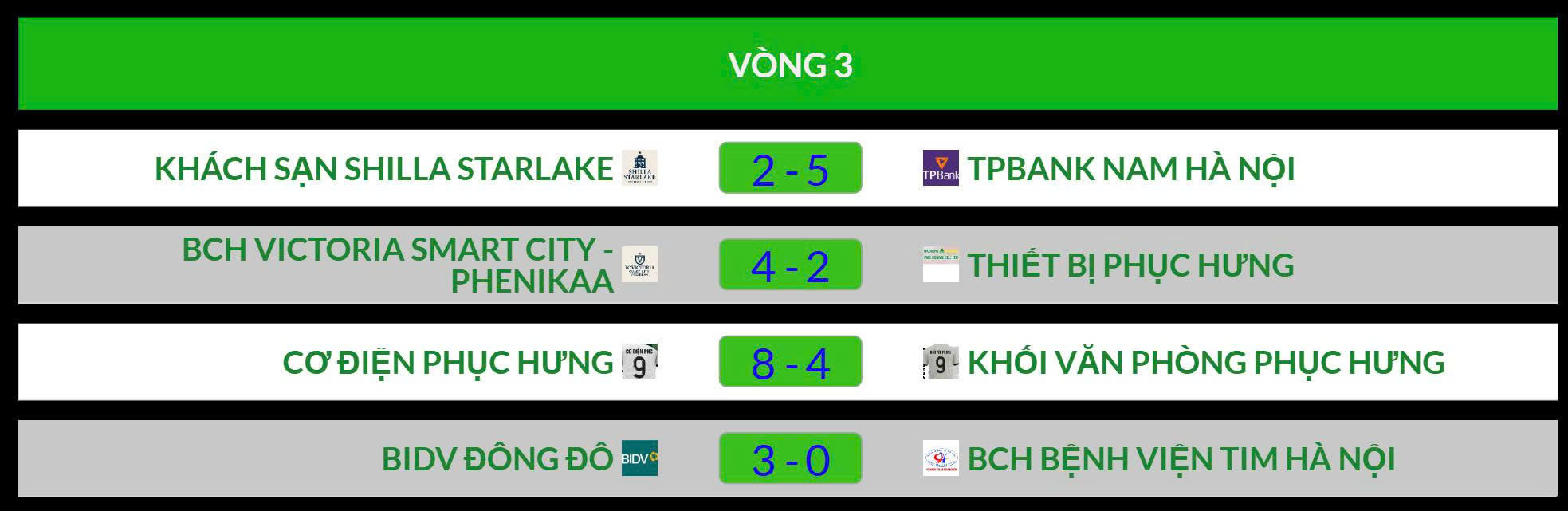 Sau 3 vòng đấu, 4 đội bóng góp mặt tại vòng bán kết đã chính thức lộ diện gồm: BCH Victoria Smart City – Phenikaa, BIDV Đông Đô, TPBank Nam Hà Nội và Cơ điện Phục Hưng.