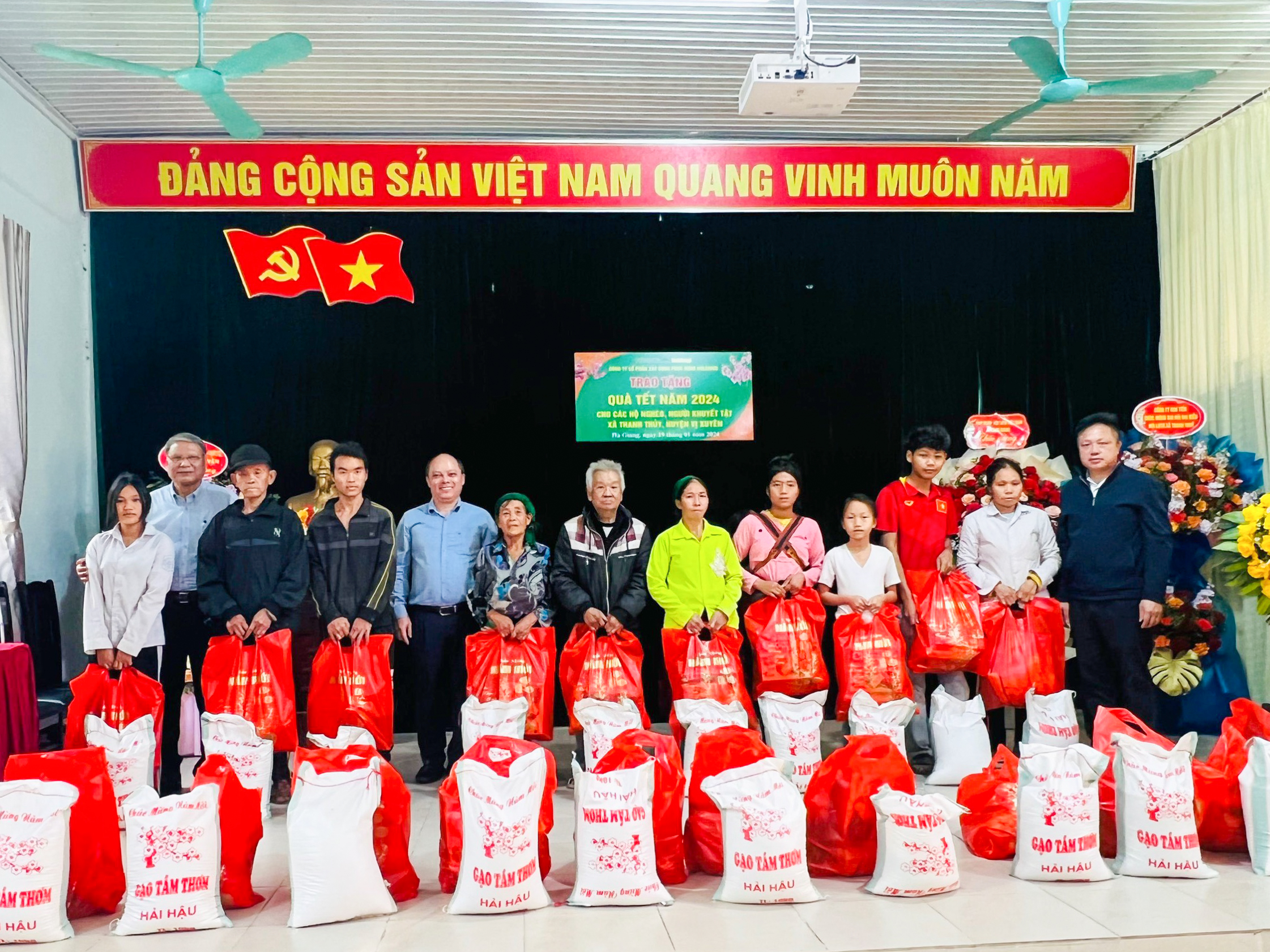 Tổng giám đốc Trần Hồng Phúc, Thành viên Hội đồng Quản trị Nguyễn Ngọc Điệp, Chủ tịch công đoàn kiêm Phó Tổng giám đốc Trần Thắng Lợi trao tặng quà cho các hộ nghèo & người khuyết tật xã Thanh Thủy
