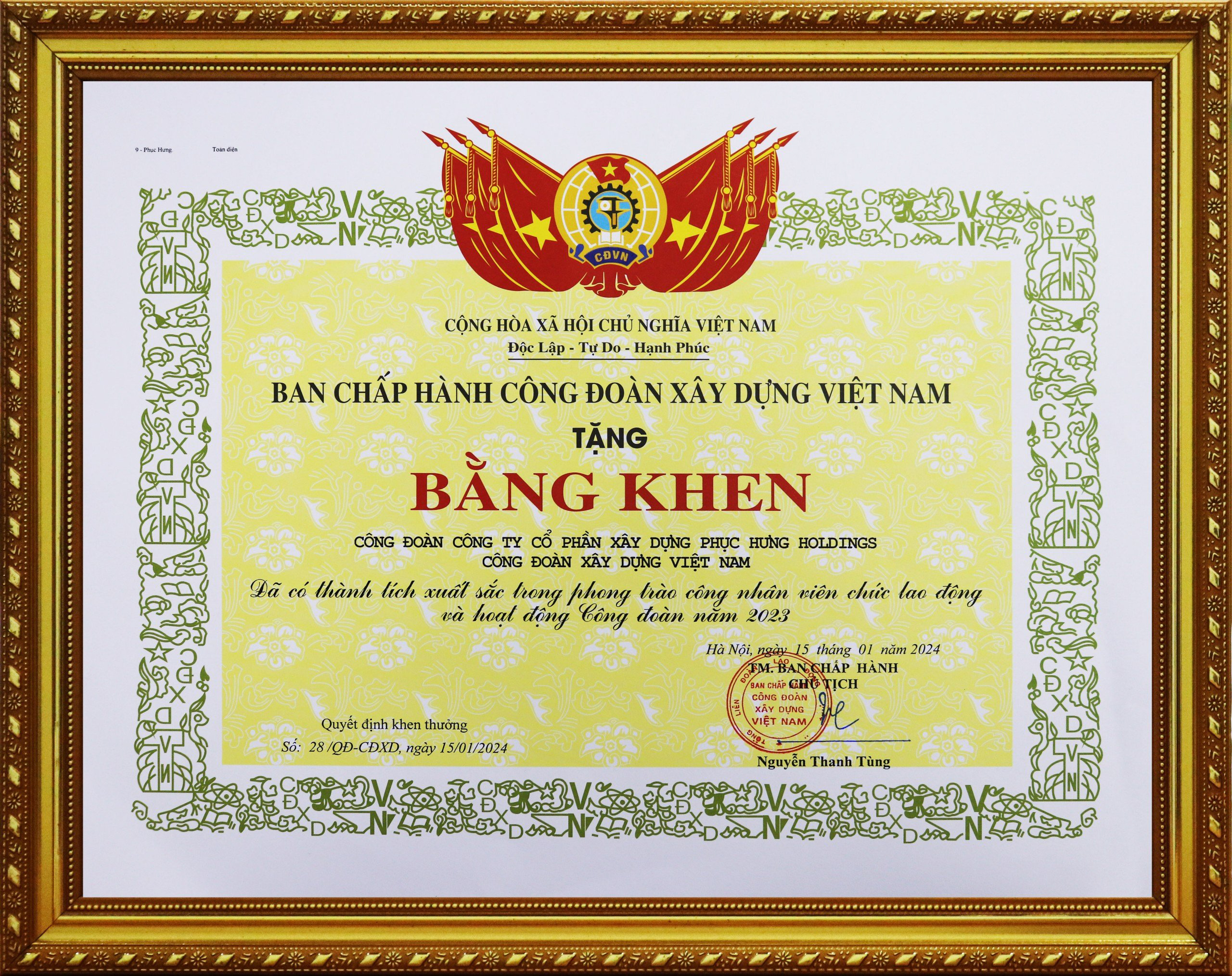 Với những hoạt động thiện nguyện thiết thực luôn hướng tới cộng đồng, mang ý nghĩa xã hội và nhân văn sâu sắc - “Chung tay vì người nghèo - không để ai bị bỏ lại phía sau”, tại Hội nghị Tổng kết hoạt động Công đoàn năm 2023, triển khai nhiệm vụ năm 2024, Công đoàn Phục Hưng Holdings vinh dự được Công đoàn Xây dựng Việt Nam tặng Bằng khen vì đã có thành tích xuất sắc trong phong trào công nhân viên chức lao động và hoạt động Công đoàn năm 2023. Đây là thành tích xứng đáng trong việc xây dựng, triển khai thực hiện kịp thời các chương trình, kế hoạch, hướng dẫn, các chủ trương, nghị quyết của Công đoàn Xây dựng Việt Nam.