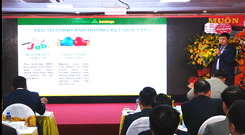 Thay mặt Ban điều hành, Tổng Giám đốc Đặng Trọng Đức báo cáo kết quả hoạt động sản xuất kinh doanh năm 2024 và phương hướng, nhiệm vụ năm 2025. Năm 2024, trong bối cảnh khó khăn chung, nguồn việc khan hiếm và sự cạnh tranh quyết liệt của các doanh nghiệp trong ngành nhưng hoạt động sản xuất kinh doanh của Công ty đã đạt được những kết quả khả quan, tạo việc làm ổn định cho người lao động. Phục Hưng Holdings đã trúng thầu và tham gia thi công đảm bảo chất lượng, nhiều dự án vượt tiến độ, nhận được sự đánh giá cao từ phía Chủ đầu tư, tạo tiền đề cho sự phát triển trong những năm tới. Việc ứng dụng phần mềm, công nghệ trong sản xuất kinh doanh tiếp tục được triển khai, giải pháp công nghệ Bim Revit và Cubicost được ứng dụng thành công đem lại hiệu quả cao tại nhiều dự án.