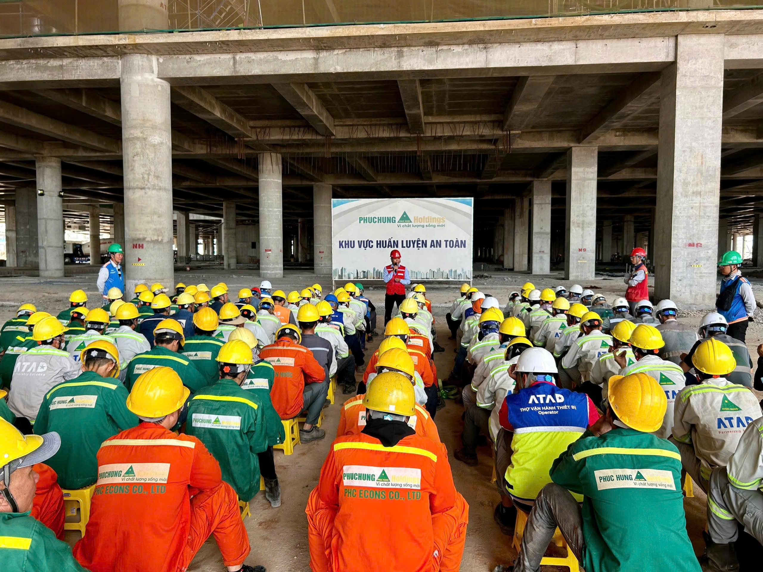 Ba trăm kỹ sư và công nhân tham gia thi công, hình ảnh tại một buổi huấn luyện an toàn tại công trường