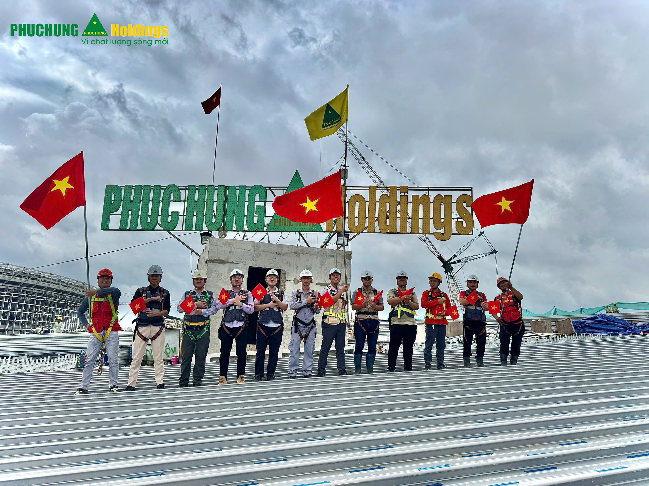 Cờ Tổ quốc tung bay trên nóc công trình Sân bay Long Thành trong ngày lễ Quốc khánh 2/9 tại phần Dự án Phục Hưng Holdings thi công