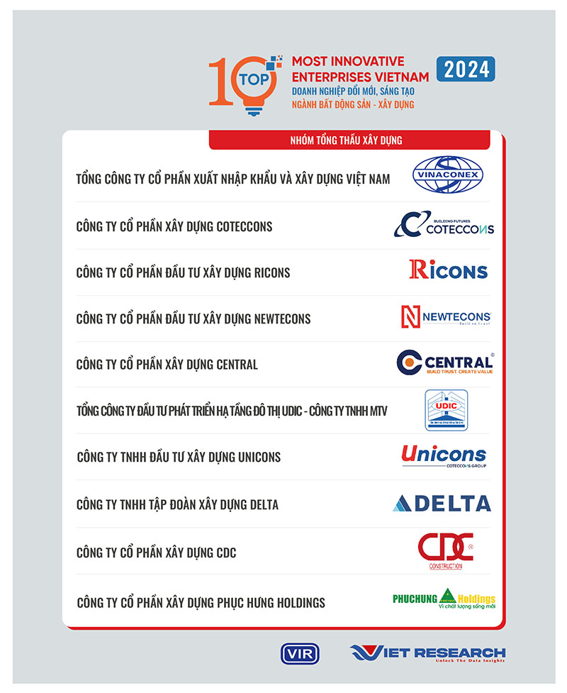 Top 10 Doanh nghiệp Đổi mới, Sáng tạo và Kinh doanh hiệu quả ngành Bất động sản – Xây dựng 2024 - Nhóm Tổng thầu xây dựng