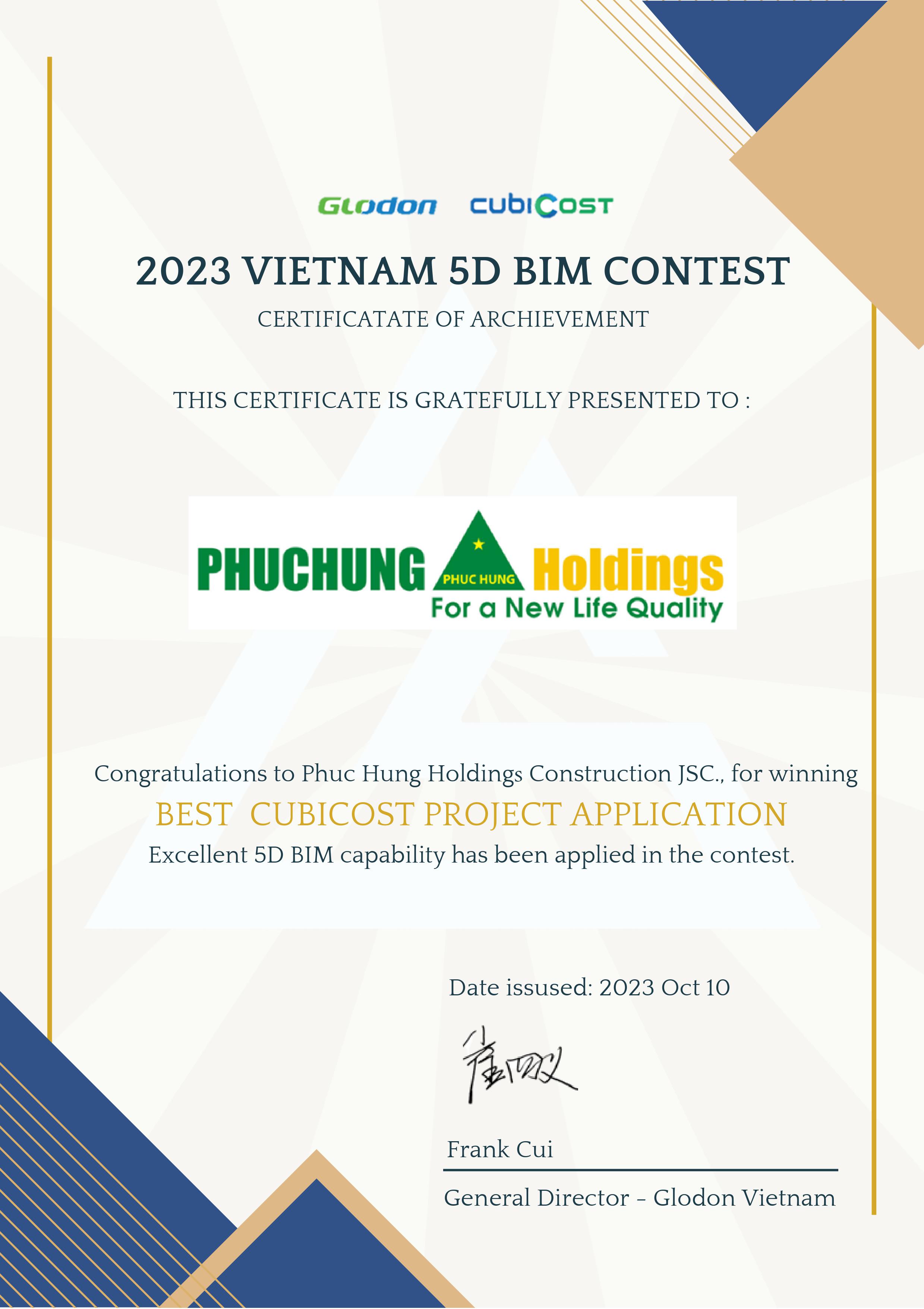 Với những nỗ lực không ngừng, hai năm liên tục (2022 và 2023) Phục Hưng Holdings được Tổ chức Glodon Việt Nam ghi danh ở giải nhất cuộc thi “Dự án áp dụng mô hình BIM 5D tốt nhất năm”.