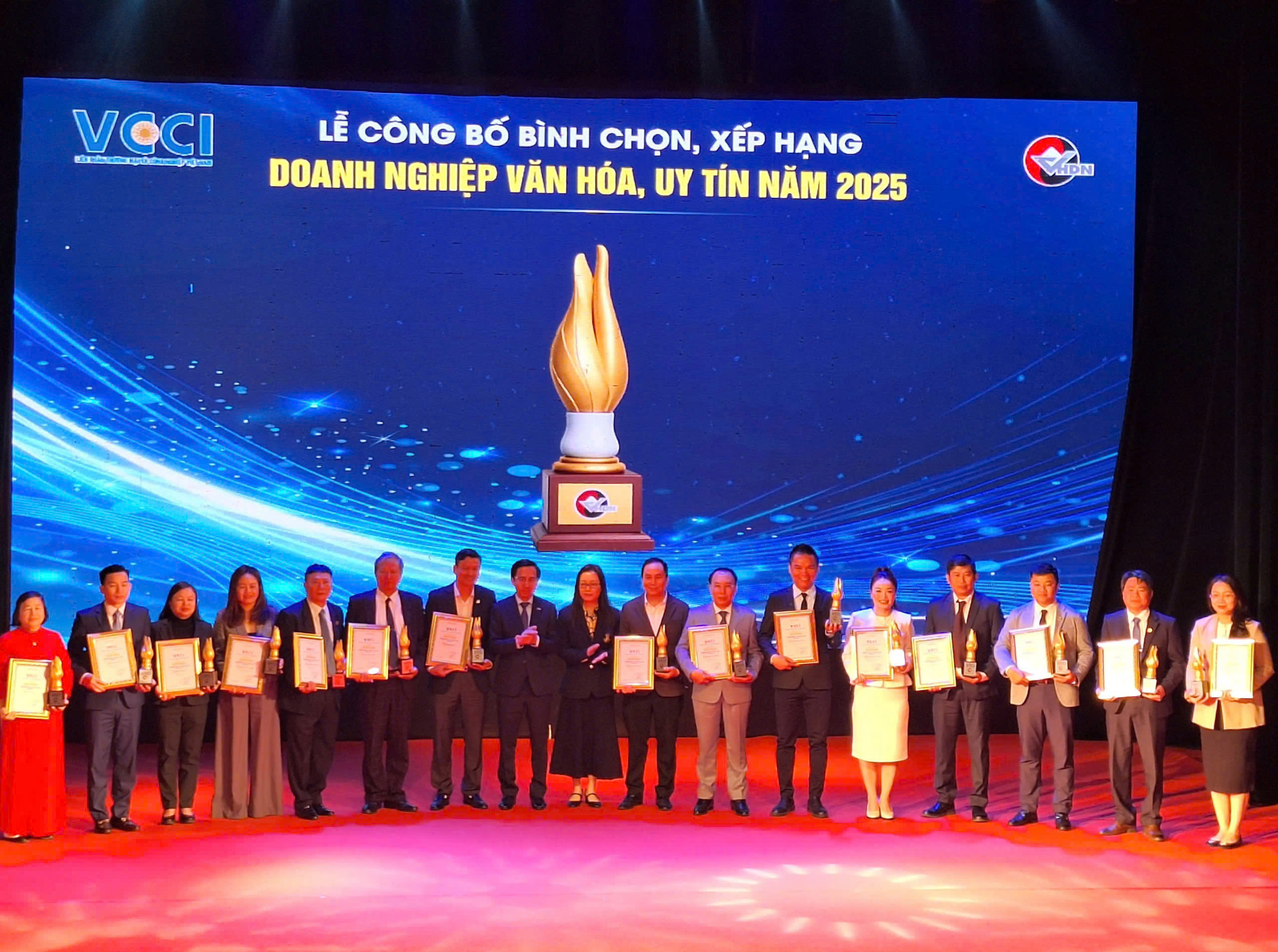 Tổng Giám đốc Đặng Trọng Đức (thứ 3 từ phải sang) cùng đại diện các doanh nghiệp đón nhận danh hiệu“Doanh nghiệp văn hoá, uy tín” năm 2025 tại Lễ vinh danh