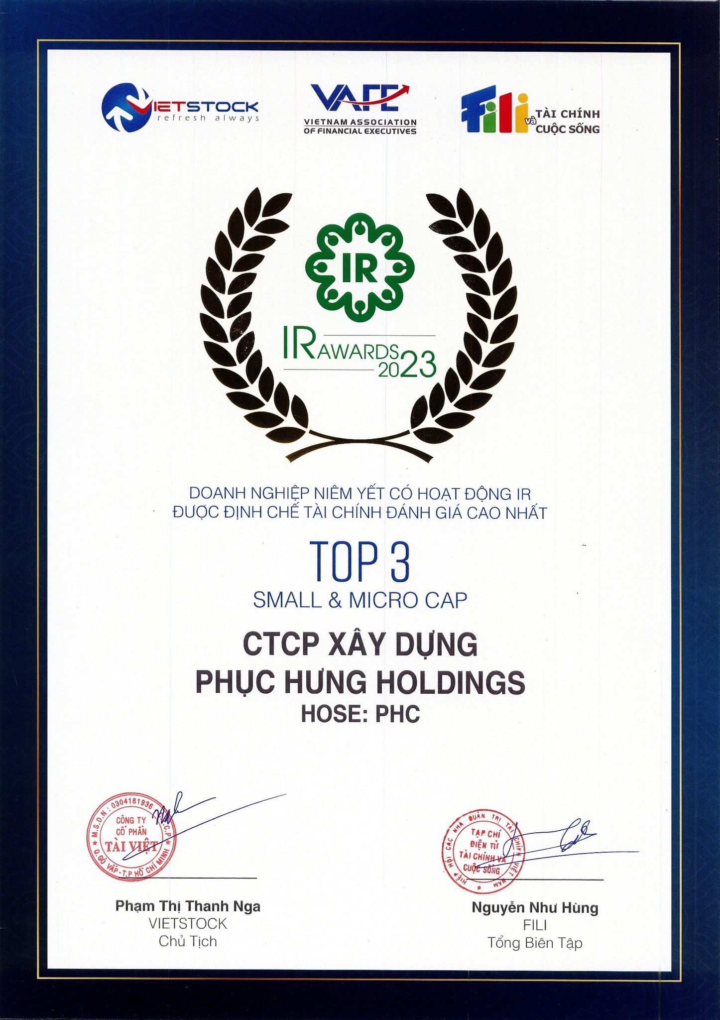 Công ty Cổ phần Xây dựng Phục Hưng Holdings nhận chứng nhận Top 3 Small & Micro Cap – Doanh nghiệp niêm yết có hoạt động IR được định chế tài chính đánh giá cao nhất năm 2023