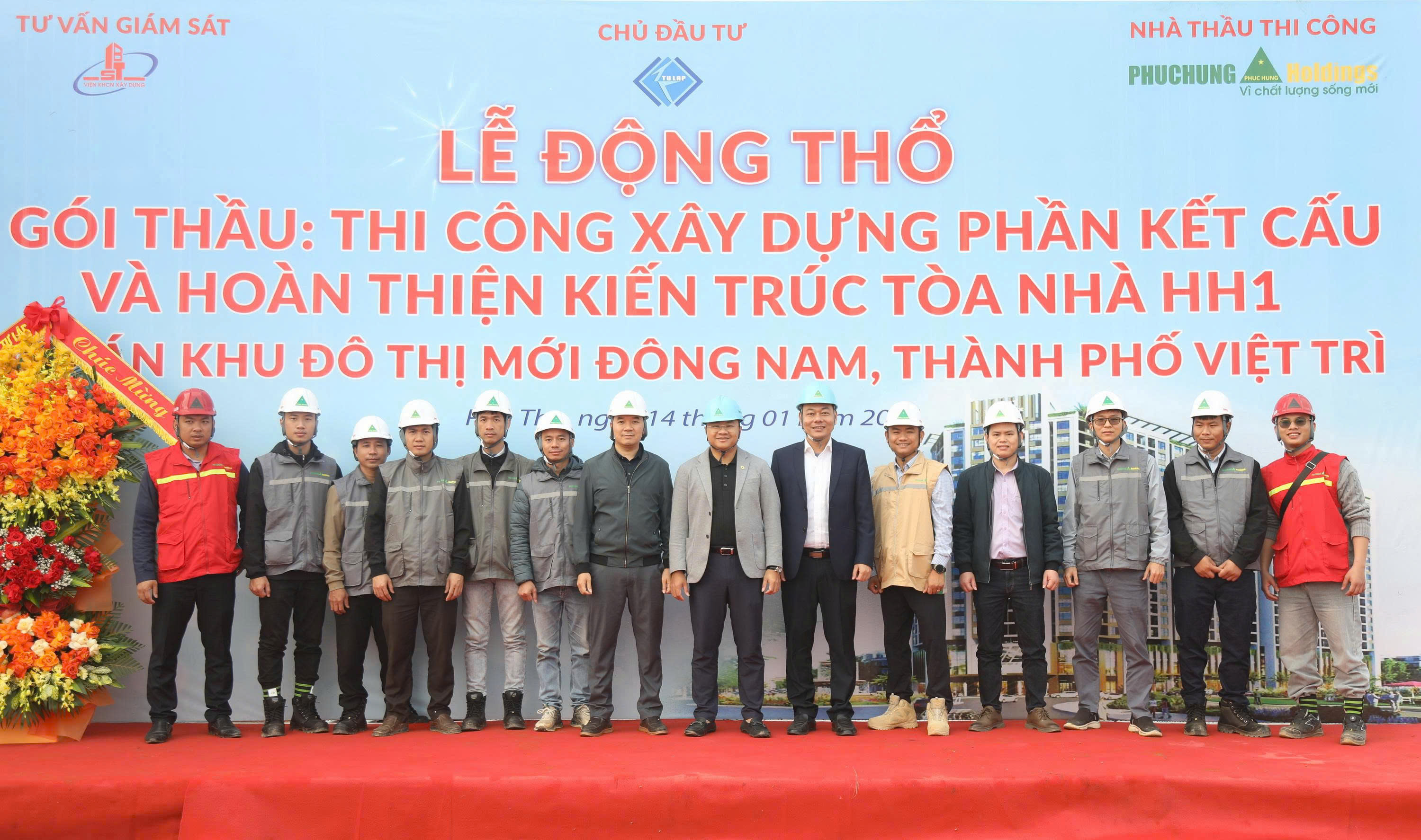 Tổng giám đốc Đặng Trọng Đức cùng đại diện Ban Lãnh đạo, Ban Chỉ huy công trường Phục Hưng Holdings và ông Đặng Đức Tùng - Phó giám đốc Công ty TNHH Xây dựng Tự Lập cùng đại diện Lãnh đạo Chủ đầu tư; Tư vấn giám sát chụp ảnh lưu niệm tại Lễ động thổ