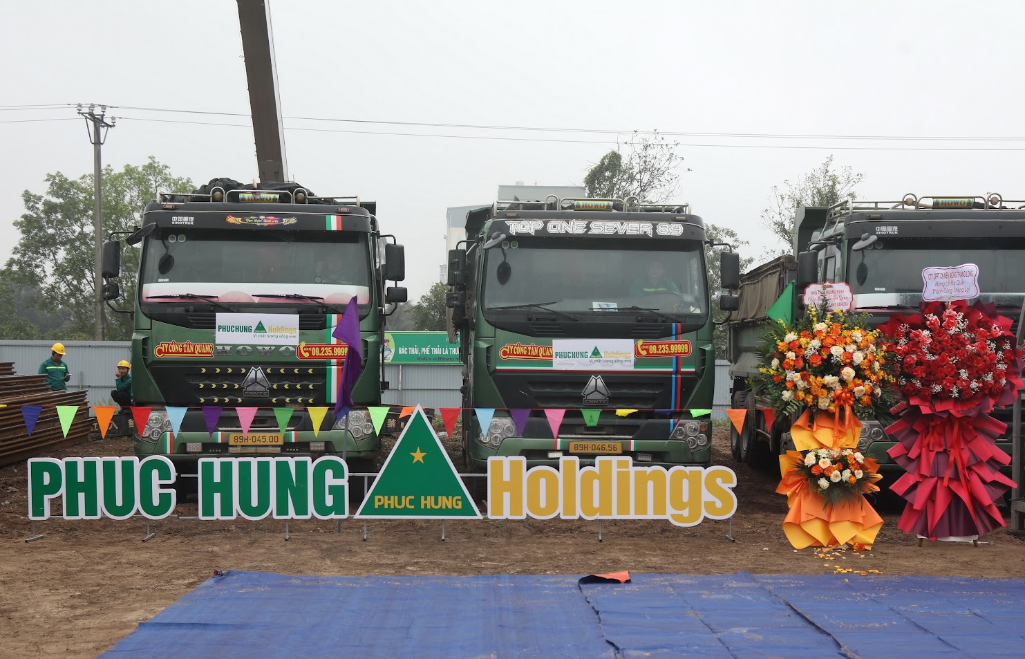Chủ tịch HĐQT Cao Tùng Lâm, Tổng Giám đốc Đặng Trọng Đức và các Phó Tổng Giám đốc, đại diện các phòng, ban, đơn vị cùng toàn thể cán bộ nhân viên Phục Hưng Holings tại công trường và Đại diện Chủ đầu tư Gamuda Land chụp ảnh lưu niệm, thể hiện quyết tâm, tinh thần đoàn kết tại lễ ra quân dự án Chung cư HH2 Gamuda, Yên Sở