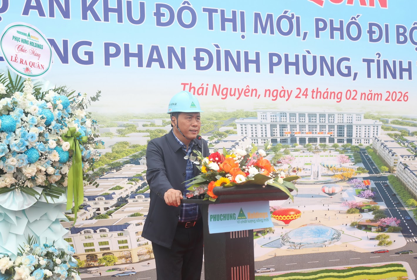 Tổng Giám đốc Đặng Trọng Đức phát biểu Chúc mừng năm mới đại diện Chủ đầu tư và toàn thể Cán bộ nhân viên Phục Hưng Holdings tham gia dự án Khu đô thị mới, phố đi bộ trung tâm phường Phan Đình Phùng, tỉnh Thái Nguyên