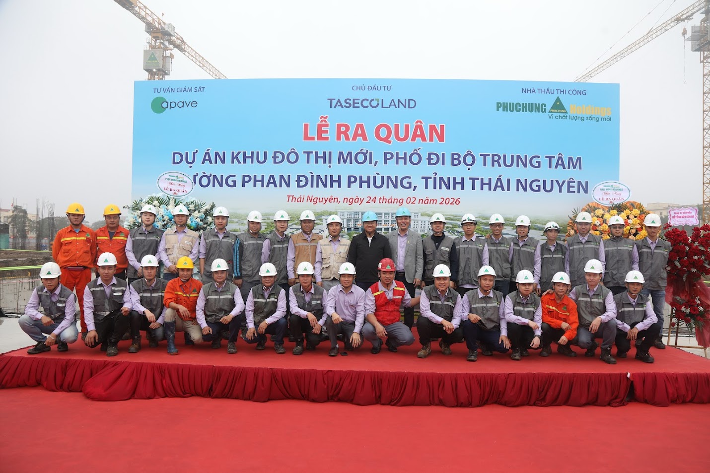 Chủ tịch HĐQT Cao Tùng Lâm, Tổng Giám đốc Đặng Trọng Đức và các Phó Tổng Giám đốc, đại diện các phòng, ban, đơn vị cùng toàn thể cán bộ nhân viên Phục Hưng Holings tại công trường và Đại diện Chủ đầu tư Taseco Land chụp ảnh lưu niệm, thể hiện quyết tâm, tinh thần đoàn kết tại lễ ra quân dự án Khu đô thị mới, phố đi bộ trung tâm phường Phan Đình Phùng, tỉnh Thái Nguyên