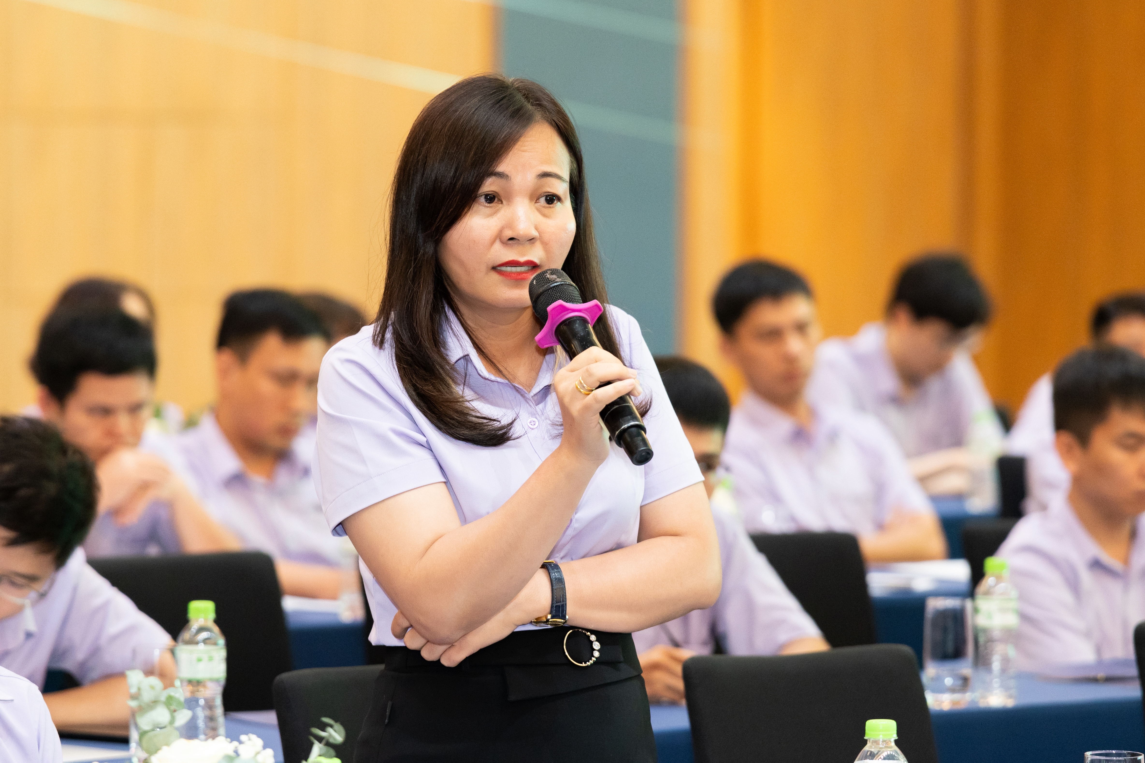 Giám đốc Nội chính kiêm Kế toán trưởng Ngô Thị Minh Nguyệt phát biểu ý kiến thảo luận liên quan đến công tác tăng cường các giải pháp quản lý chi phí trong quá trình thi công