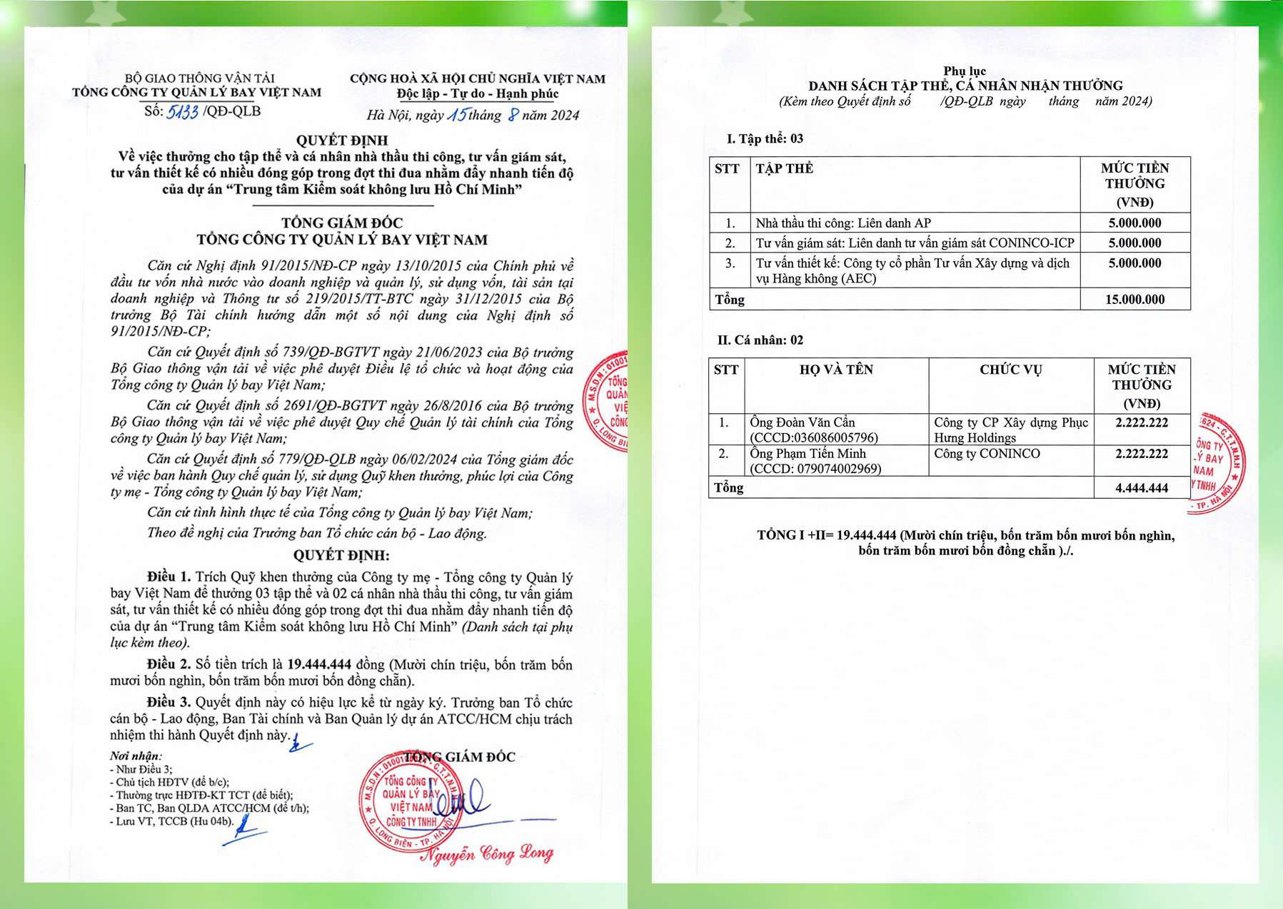 Ngày 15/8/2024, Tổng giám đốc Tổng Công ty Quản lý bay Việt Nam đã ban hành Quyết định số 5133/QĐ-QLB về việc thưởng cho tập thể và cá nhân Liên danh Nhà thầu AP, Tư vấn giám sát, Tư vấn thiết kế đã đẩy nhanh tiến độ của dự án Trung tâm Kiểm soát không lưu Hồ Chí Minh tại số 22 Trần Quốc Hoàn, phường 4, quận Tân Bình, TP. Hồ Chí Minh.