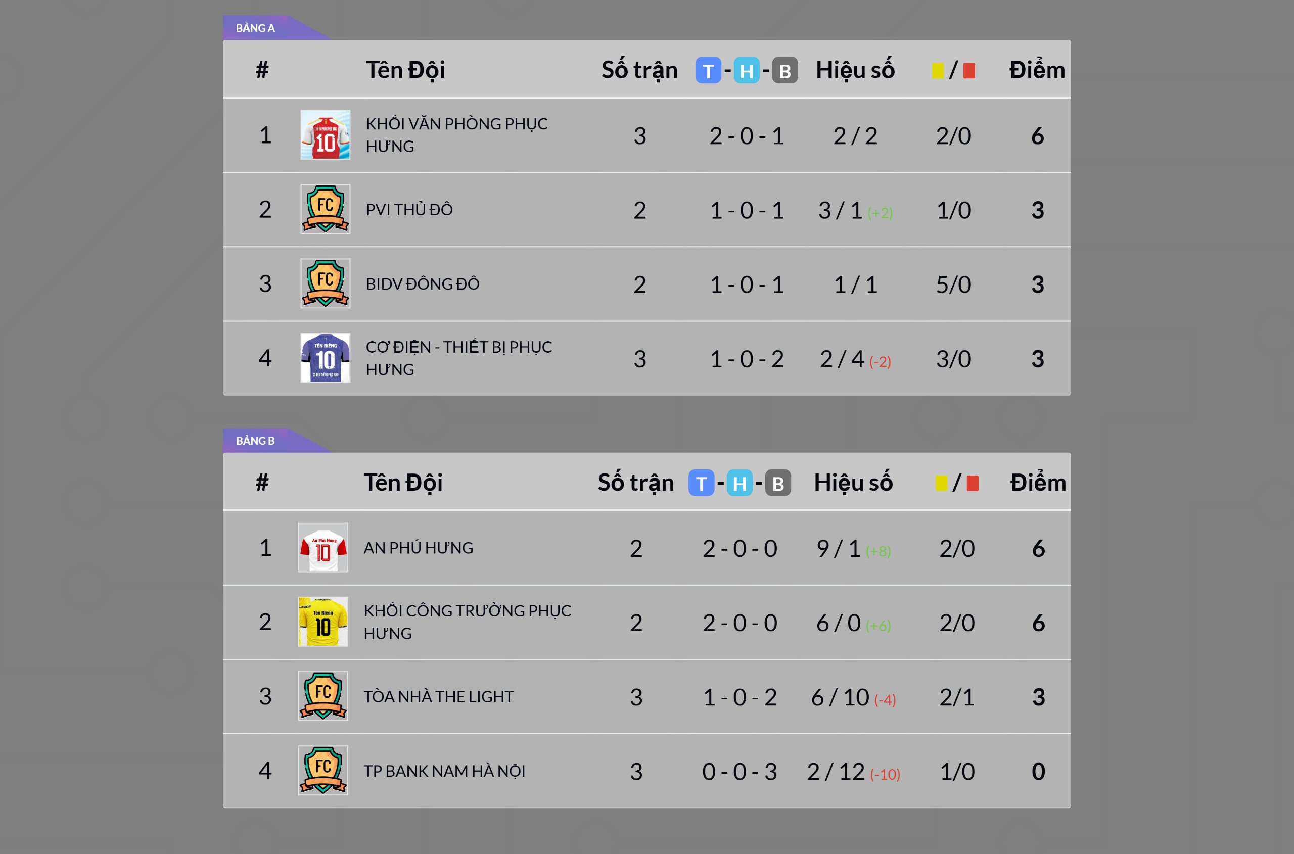 Bảng xếp hạng thi đấu các đội tại CUP Phục Hưng Holdings mở rộng năm 2024