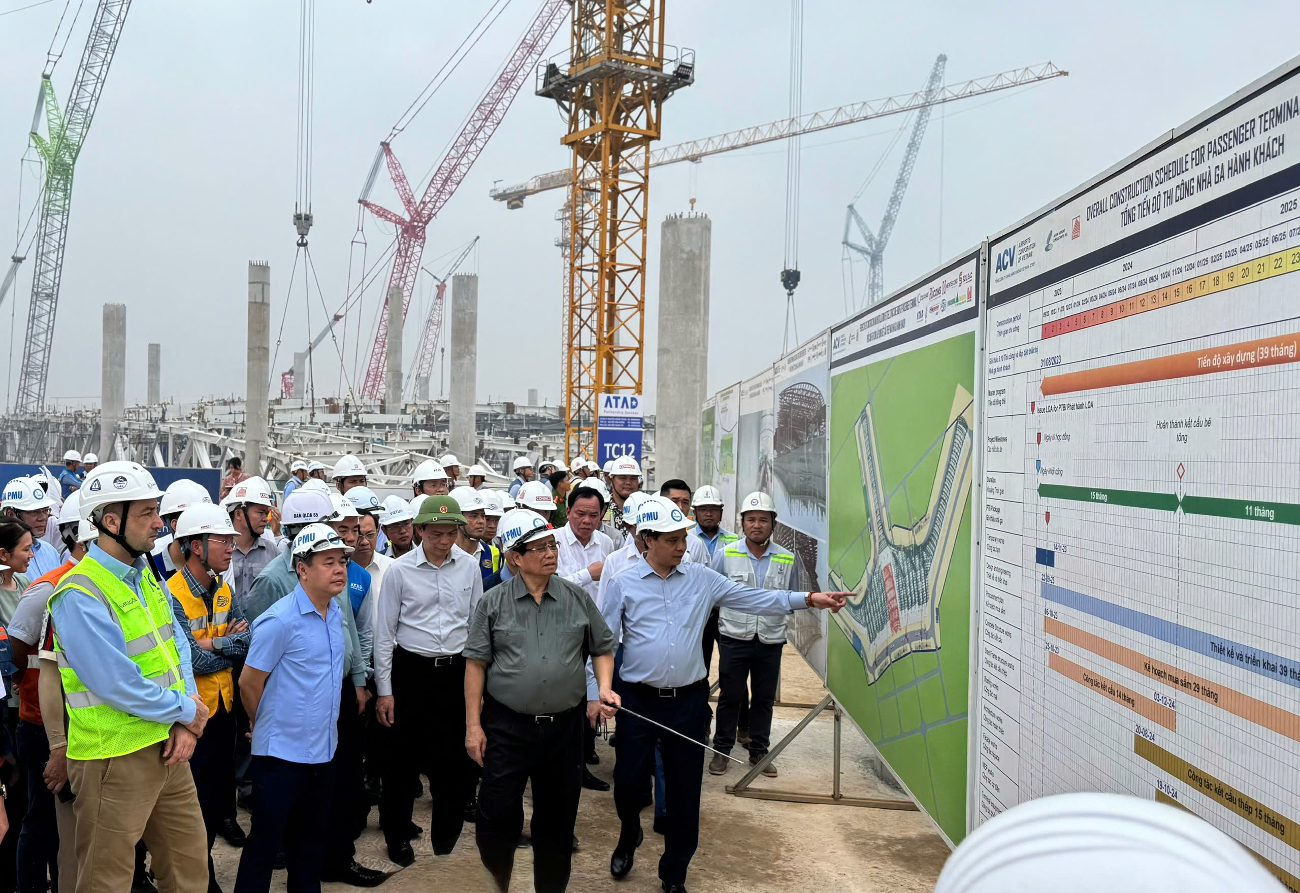 Tại công trường, Thủ tướng cùng đoàn công tác thăm hỏi, tặng quà và động viên người lao động. Đồng thời, Thủ tướng trực tiếp lên tầng 4 Nhà ga hành khách để quan sát việc thi công lắp kèo mái của sân bay.